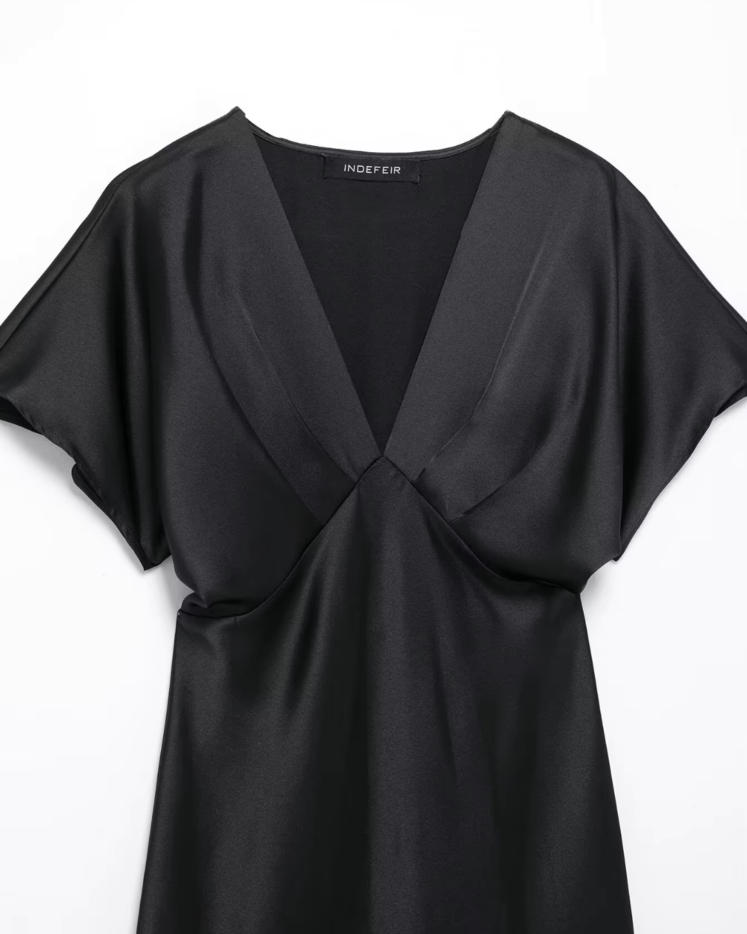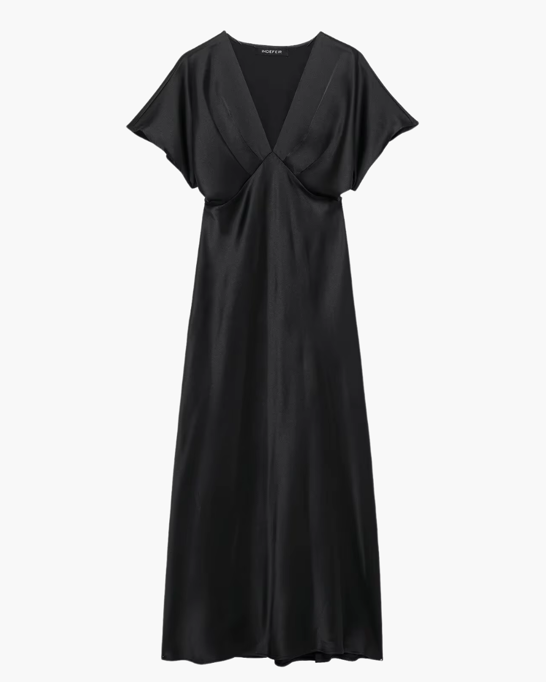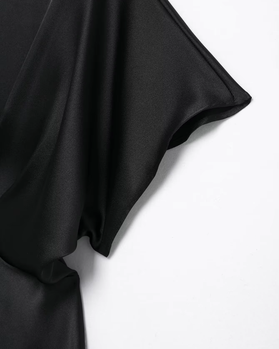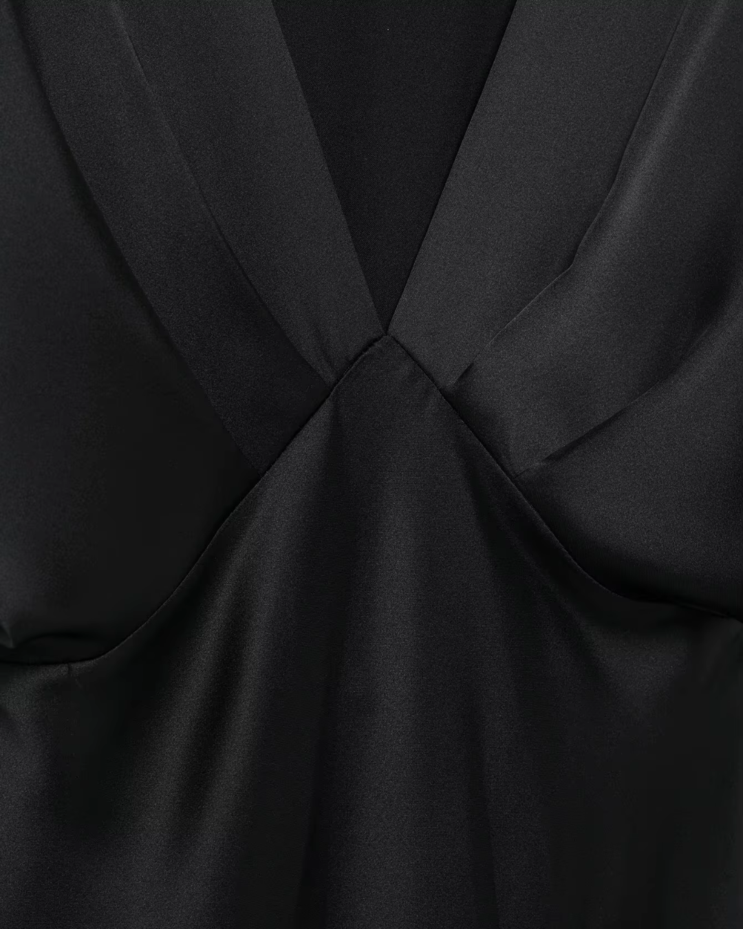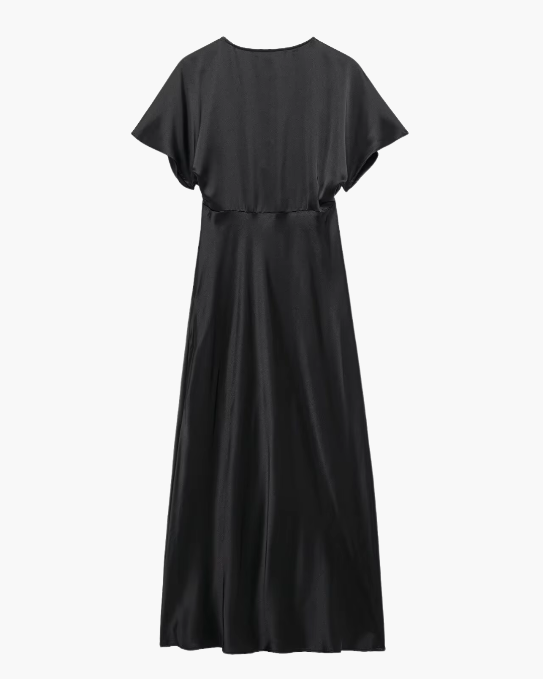 Deze elegante zomerjurk combineert vintage charme met moderne eenvoud. De zachte satijnen stof, geplooide korte mouwen en V-hals zorgen voor een vrouwelijke en verfijnde look. De rechte lange pasvorm maakt deze jurk perfect voor zowel een casual zomerdag als een feestelijk moment.