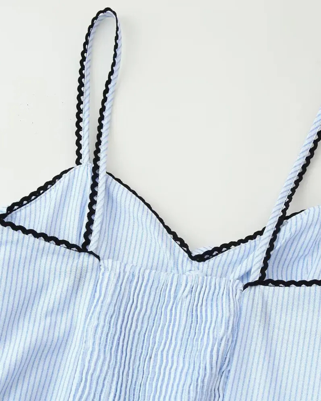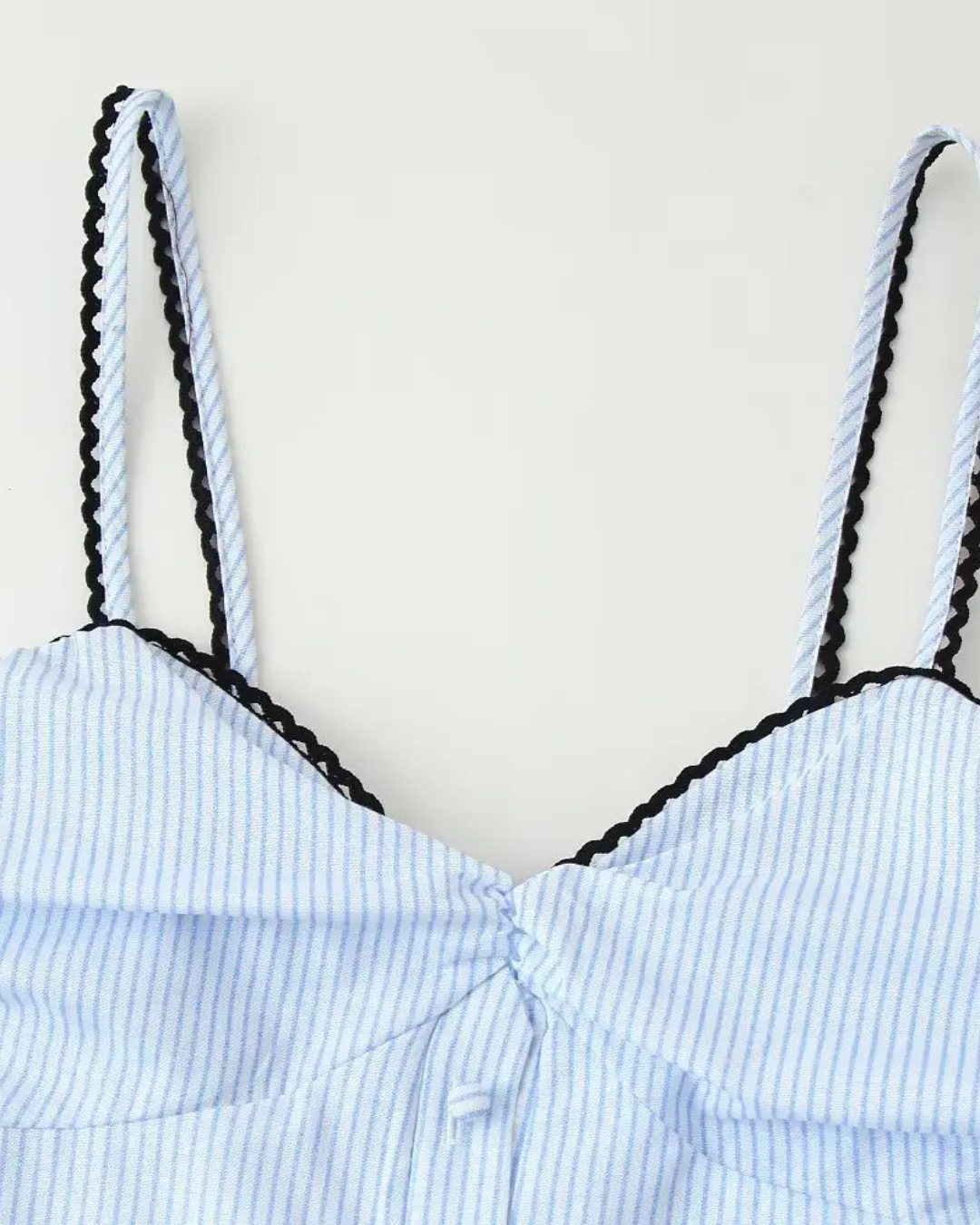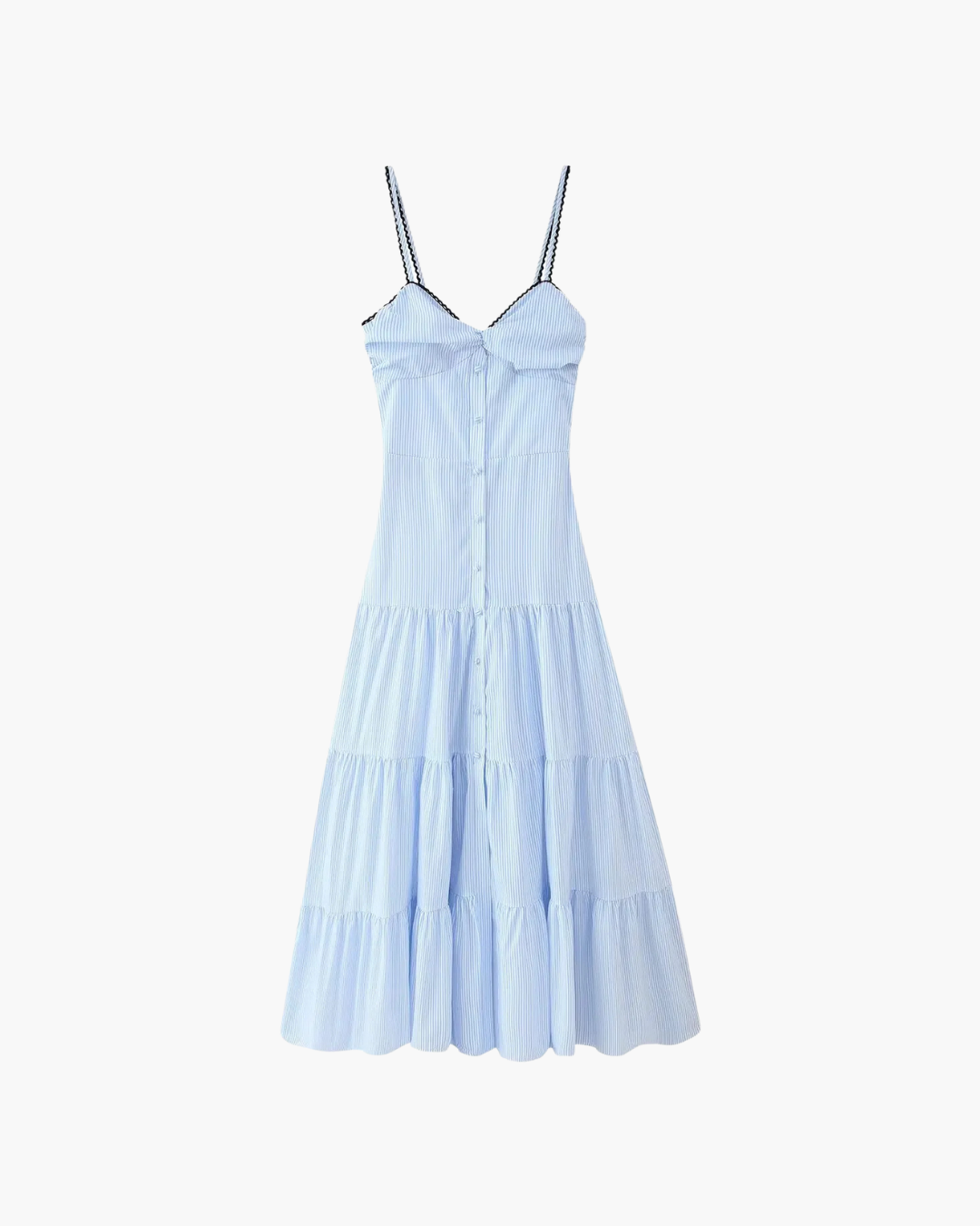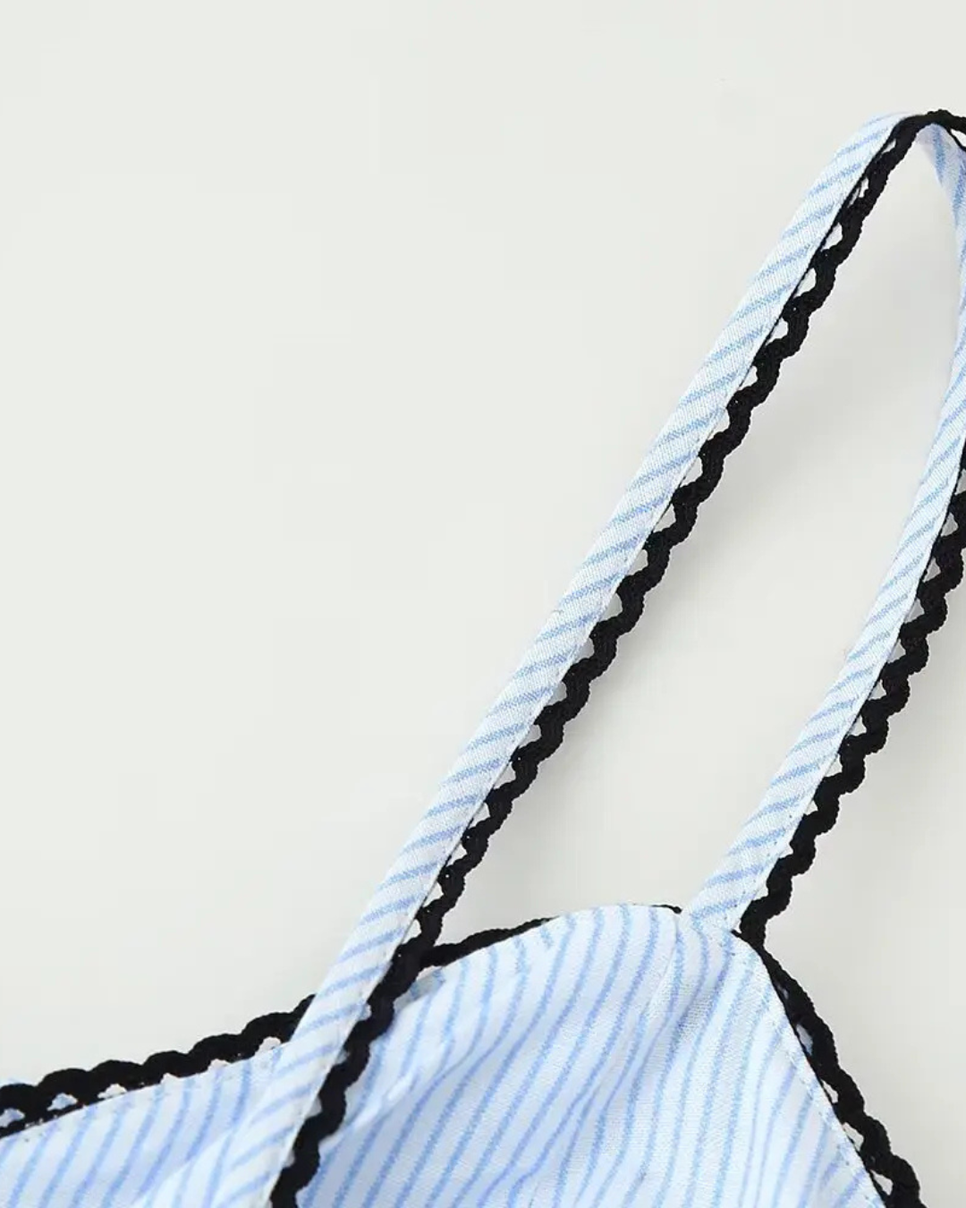 Deze elegante midi-jurk is de perfecte combinatie van verfijning en zomerse charme. Het mouwloze ontwerp met diepe V-hals en contrasterende kanten details zorgt voor een vrouwelijke en stijlvolle uitstraling. De geplooide rok en frisse blauwe strepen maken deze jurk ideaal voor stranddagen, feestjes of vakantieavonden.