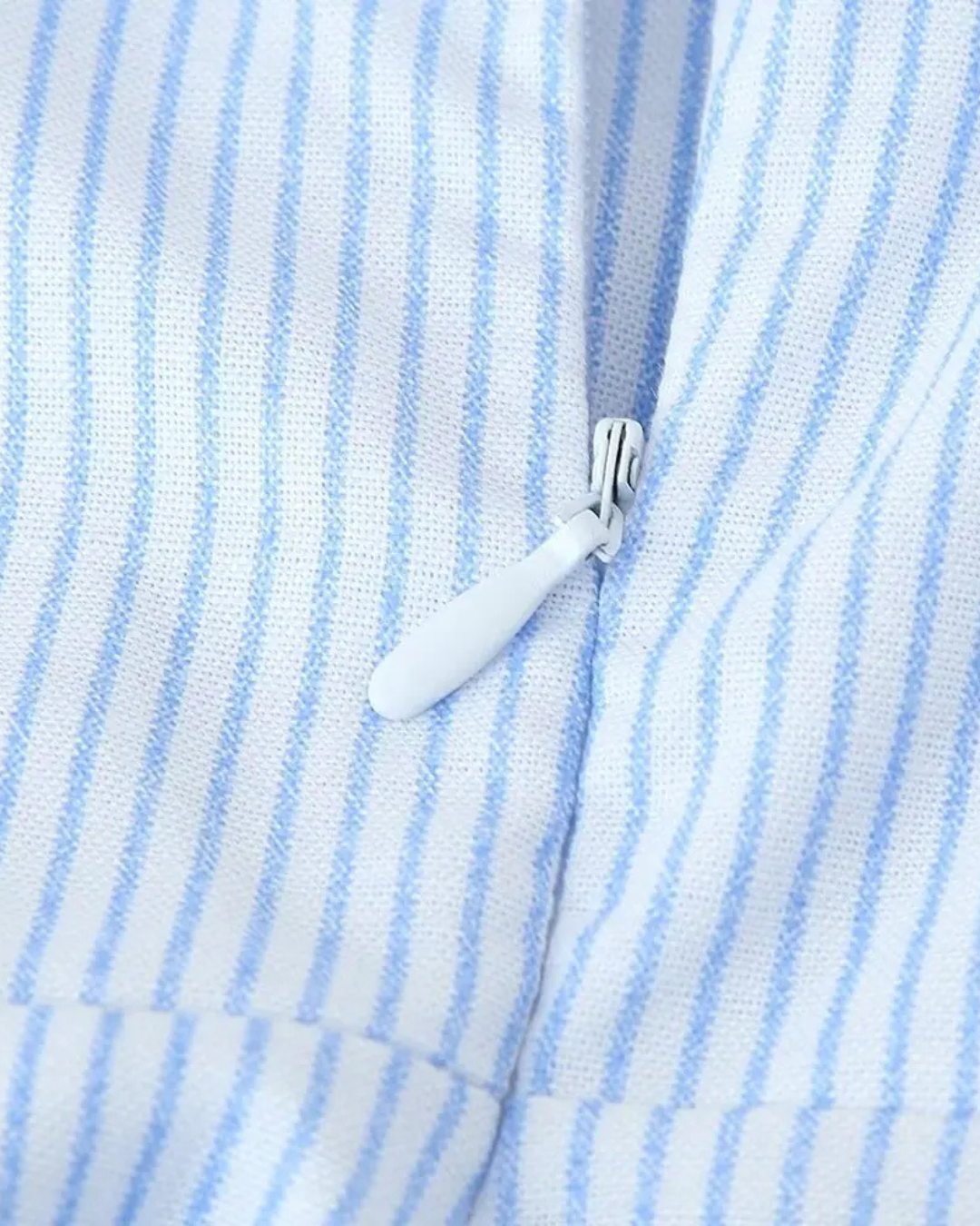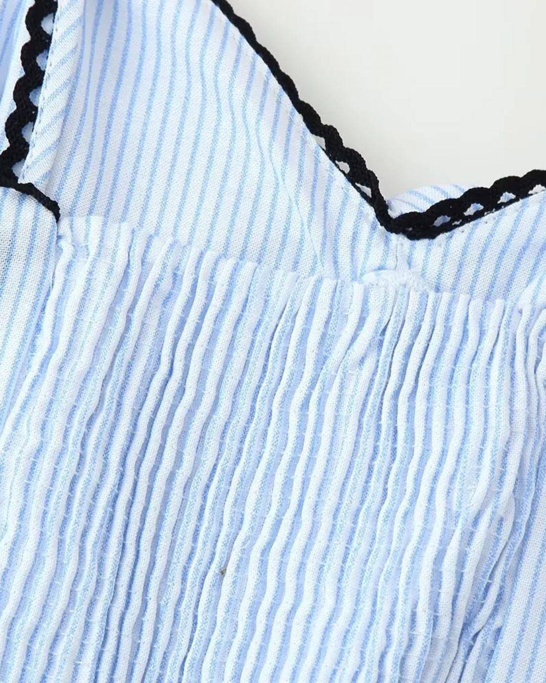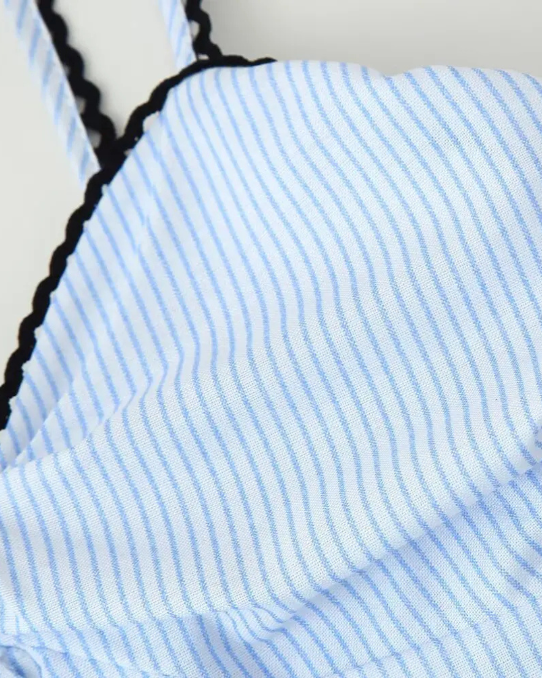 Deze elegante midi-jurk is de perfecte combinatie van verfijning en zomerse charme. Het mouwloze ontwerp met diepe V-hals en contrasterende kanten details zorgt voor een vrouwelijke en stijlvolle uitstraling. De geplooide rok en frisse blauwe strepen maken deze jurk ideaal voor stranddagen, feestjes of vakantieavonden.