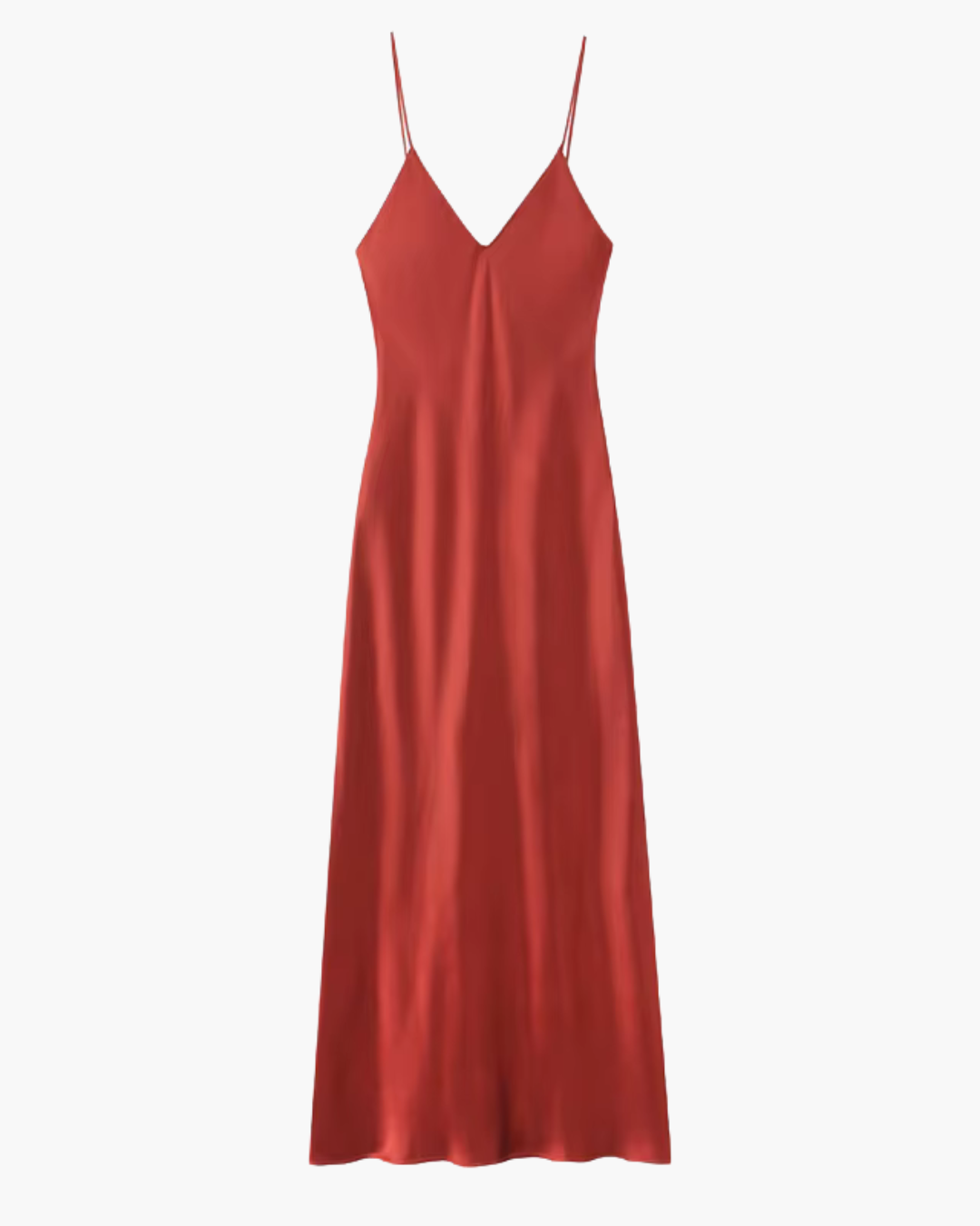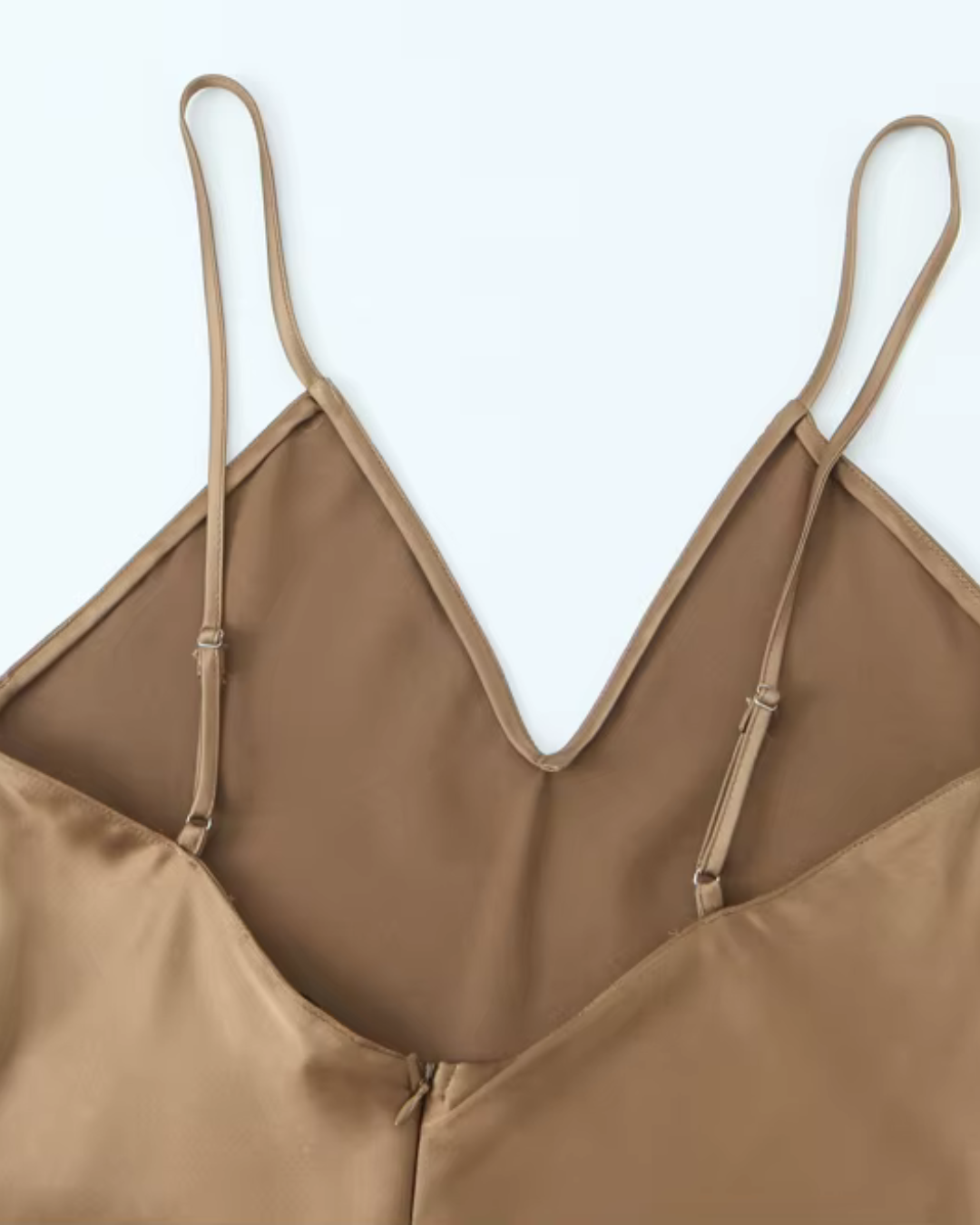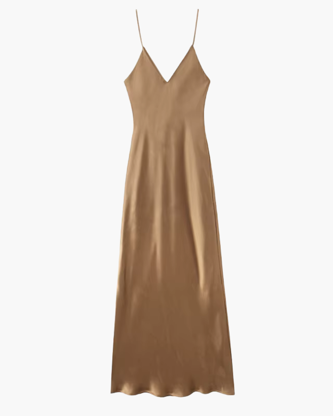 Deze elegante satijnen onderjurk is ontworpen voor dames die houden van een chique en vrouwelijke uitstraling. Met een verfijnde V-hals, subtiele ruches en een flatterende maxi-lengte is deze jurk perfect voor avondfeestjes in de lente of een stijlvolle herfstdag.