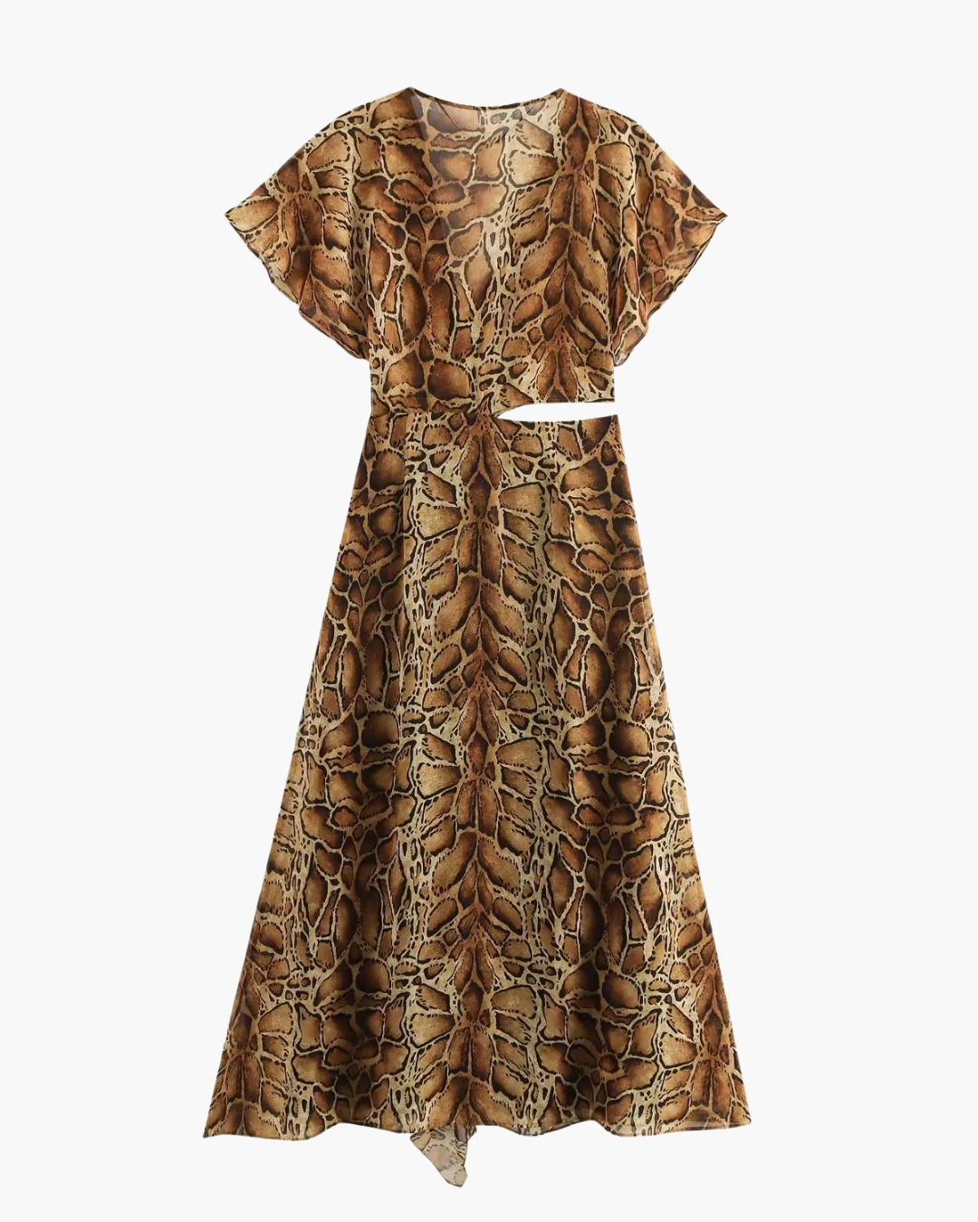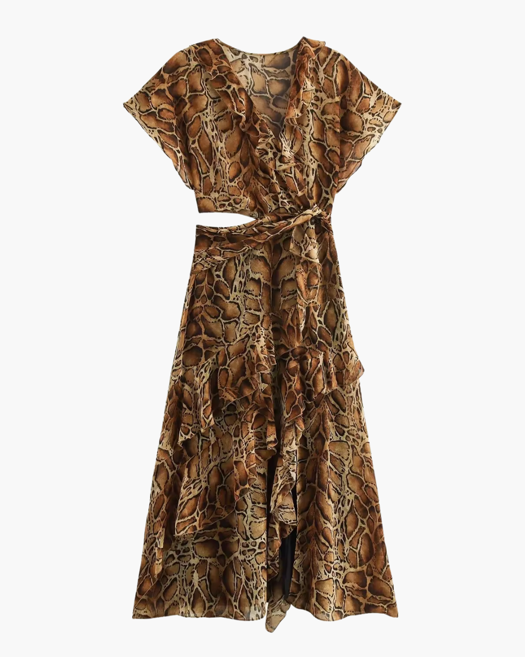 Schuine V-Hals Dierenpatroon Midi-Jurk – Trendy en Tijdloos